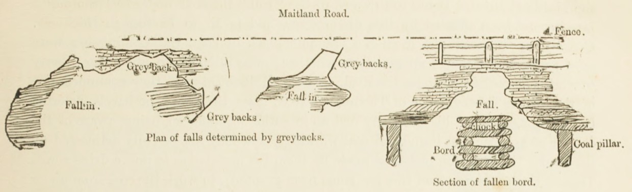 The road has been honeycombed by coal workings. Towards the south and north, the thin pillars having part been removed, the whole surface is a tumultuous mass of open pitfalls. Looking into some of these, the surface of the Maitland Road, resting on a thin crust of sandstone very much intersected with fissures, is seen to be supported on collar pillars from 2 to 4 feet thick. In some of these pitfalls, were the surface has subsided to within a few feet of the road, the lines of fracture are seen to be defined by glassy surfaces of “greybacks” or which the following sketches may convey some ideas. In one of two instances, notably in a large cavity contiguous to Spennymoor shaft, the roof appears to have rested almost entirely on wooden chocks.